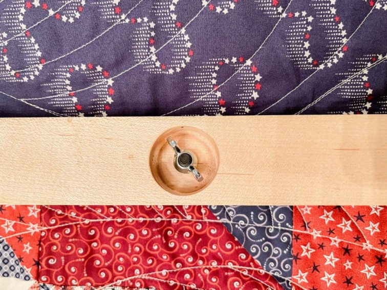 The two portions of the hanger separate and allow you to slide your quilt in between the two pieces. Simply align the quilt top near the drilled holes. Place the the top beam on top of the quilt and then insert the screws and fasteners!